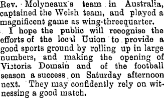 ,ev. Molynoaux's team in Australia, captained the Welsh team, and played a magnificent game as wing-threequarter. I hope the public will recognise the efforts of the local Uuion to provide a good sports ground by rolling up in large numbers, and making the opening of Victoria Domain and of the football season a success on Saturday afternoon next. They may confidently rely on witnessing a good match.