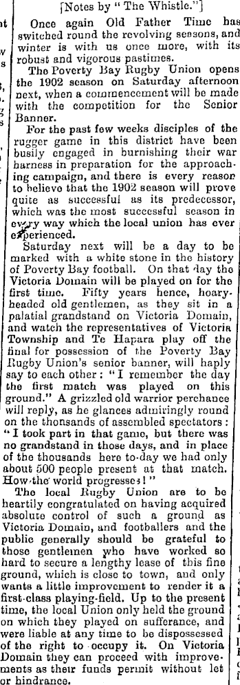 [Notes by “ The Whistle.”] Once again Old Father Time has switched round the revolving seasons, and winter is with us once more, with its robust and vigorous pastimes. The Poverty Bay Rugby Union opens the 1902 season on Saturday afternoon next, when a commencement will be made with the competition for the Senior Banner. For the past few weeks disciples of the rugger game in this district have been busily engaged in burnishing their war harness in preparation for the approaching campaign, and there is every reason to believe that the 1902 season will prove quite as successful as its predecessor, which was the most successful season in avfjy way which the local union has ever experienced. Saturday next will be a day to bo marked with a white stone in the history of Poverty Bay football. On that day the Victoria Domain will be played on for the first time. Fifty years hence, hoaryheaded old gentlemen, as they sit in a palatial grandstand on Victoria Domain, and watch the representatives of Victoria Township and Te Hapara play off the final for possession of the Poverty Bay Rugby Union’s senior banner, will haply say to each other : “ I remember the day the first match was played on this ground.” A grizzled old warrior perchance will reply, as he glances admiringly round on the thousands of assembled spectators : “ I took part in that game, but there was [ no grandstand in those days, and in place of the thousands hero to-day we had only about 500 people present at that match. How-the' world progresses 1 ” The local Rugby Union are to be heartily congratulated on having acquired absolute control of such a ground as Victoria Domain, and footballers and the public generally should be grateful to those gentlemen jvho have worked so hard to secure a lengthy lease of this fine ground, which is close to town, and only wants a little improvement to render it a first-class playing-field. Up to the present time, the local Union only held the ground on which they played on sufferance, and were liable at any time to be dispossessed of the right to occupy it. On Victoria Domain they can proceed with improvements as their funds permit without let or hindrance