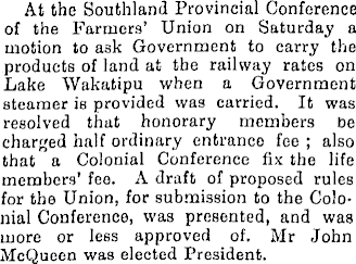At the Southland Provincial Conference of the Farmers’ Union on Saturday a motion to ask Government to carry the products of land at the railway rates on Lake Wakatipu when a Government steamer is provided was carried. It was resolved that honorary members be charged half ordinary entrance fee ; also that a Colonial Conference fix the life members' fee. A draft of proposed rules for the Union, for submission to the Colonial Conference, was presented, and was more or less approved of. Mr JohnMcQueen was elected President.