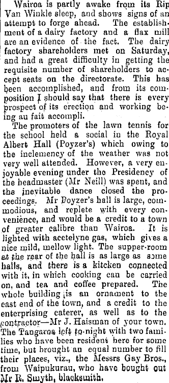 Waivoa is partly awake from its Rip Van Winkle sleep, and shows signs of an attempt to forge ahead. The establishment of a dairy factory and a flax mill are an evidence of the fact. The dairy factory shareholders met on Saturday, and had a great difficulty in getting the requisite number of shareholders to accept seats on the directorate. This has been accomplished, and from its composition I should say that there is every prospect of its erection and working being au fait accompli. The promoters of the lawn tennis for the school held a social in the Royal Albert Hall (Poyzer’s) which owing to the inclemency of the weather was not very well attended. However, a very enjoyable evening under tho Presidency of the headmaster (Mr Neill) was spent, and the inevitable dance closed the proceedings. Mr Boyzer’s hall is large, commodious, and replete with every convenience, and would be a credit to a town of greater calibre than Wairoa. It is lighted with acetelyne gas, which gives a nice mild, mellow light. The supper-room at the rear of the hall is as large as some halls, and there is a kiteken connected with it, in which cooking can be carried on, and tea and coffee prepared. The whole building ~is an ornament to the east end of the town, and a credit to the enterprising caterer, as well as to the pontpactor —Mr J. Haisman of your town. The Tangaroa Ipft to-night with two families who have been resident here for some time, but brought an equal number to fill their places, viz., the Messrs Gay Bros., from Waipukurau, who have bought out Jlr R, Smyth, blacksmith,