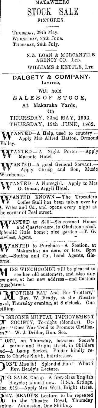 MATAWHEKO STOCK SALE FIXTURES. Thubsday, 29th May. VVed.ni'Bday, 25th June. Thursday, 24th July. N.Z. LOAN & MERCANTILE AGENCY CO., Ltd. WILLIAMS & KETTLE, Ltd. DALGETY & COMPANY. Limited, Will hold SALES OF STOCK, At Makaraka Yards, On THURSDAY, 22nd MAY, 1902. THURSDAY, 19th JUNE, 1902. WANTED— A Help, U3ed to country. — Apply Mrs Alfred Hatton, Ormond Valley. ANTED —A Night Porter —Apply Masonic Hotel WANTED —A good General Servant.— Apply Chrisp and Son, Music Warehouse. Nursegirl.—Apply to Mrs V 7 G. Oman, Argyll Hotel. WANTED KNOWN —The Trocadero Coffee Stall has been taken over by A. Wiles and Co., and opc-ns every night at the corner of Peel street. INSTANT ED to Sell-Six roomed House VV and Quarter-acre, in Gladstone road Iplendid little home; nice garden.—T. G lawless, Agent. ~ WANTED to .Purchase -A Section, at Makaraka; an acre, or less. Spot iaeh.—Stubbs and Co , Land Agents, Gislorne. ]%y| ISS WINCHCOMBE will bo pleased to It I see her old customers, and also any iew ones, at her new address—end Oust louse’street. ( ■m/TOTHER RAT And Her Trotters,” ItjL Rev. W. Ready, at the Theatre [oval, Thursday evening, at 8 o’clock. One billing. ISBORNE MUTUAL IVIPItOVEMENT JT SOCIETY, To night (Mondav). Deate : “ Does War Tend to Promote Civilisaon ?” —W. J. Driller, Hon. Sec. r OST, on Thursday, between Score’s U onrner and Brpht street, in Childers lad—A Lamp Socket. Finder kindly reirn to Charles-Smith, hairdresser. 0 ON’T Miss it! Splendid Fun ! What ? Rev. Ready’s Lecture. I7IOR SALE, Cheap—A first-class English D Bicycle; almost new. B.S.A. fittings, rice, £l2.—Apply Mrs West, Blight striet. > EV. READY’S Lecture to bo repeated lit in the Theatre Royal, Thursday ening. Admission, One Shilling.