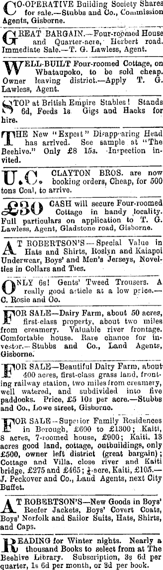 CO-OPERATIVE Building Society Shares for sale.—Stubbs and Co., Commission Agents, Gisborne. dT 4 REAT BARGAIN.—Four-ropmed House VUT and Quarter-acre, Herbert road. Immediate Sale.—T. G. Lawless, Agent. WELL-BUILT Four-roomed Cottage, on Wbataupoko, to be sold cheap. Owner leaving district.—Apply T. G. Lawless, Agent. BTOP8 TOP at British Empire Stables I Stands 6d, Feeds Is Gigs and Hacks for hire. THE New '‘Expert” Disappearing Head has arrived. See sample at “The Beehive.” Only £8 15s. In?pection invited. CLAYTON BROS, are now * \ ® booking orders, Cheap, for 500 tons Coal, to arrive. GQA CASH will secure Four-roomed obt)l/ Cottage in handy locality. Full particulars on application to T. G. Lawless, Agent, Gladstone road, Gisborne. T ROBERTSON’S —Special Value in Hats and Shirts, Itoslyn and Kaiapoi Underwear, Boys’ and Men’s Jerseys, Novelties in Collars and Ties. ONLY 6s! Gents’ Tweed Trousers. A really good article at a low price.— C. Rosie and 00. FOR SALE —Dairy Farm, about 50 acres, first-class property, about two miles from creamery. Valuable river frontage. Comfortable house. Rare chanoe for investor.— Stubbs and Co., Land Agents, Gisborne. FOR SALE—Beautiful Dairy Farm, about 400 acres, first-class grass land, fronting railway station, tw'o miles (rom creamery, well watered, and subdivided into five paddocks. Price, £5 103 per acre.—Stubbs and Co., Lowe street, Gisborne. FOR SALE-Supciior Family Residences in Borough, £6OO to £1300; Kaiti, 8 acres, 7-roomed house, £900; Kaiti. 13 acres good land, cottage, outbuildings, only £SOO, owner left district (great bargain); Cottage and Villa, close river and Kaiti bridge, £275 and £465; J-acre, Kaiti, £lO5. J. Peckover and Co., Laud Agents, next City Buffet. AT ROBERTSON’S—New Goods in Boyß’ Reefer Jackets, Boys’ Covert Coats, Boys’ Norfolk and Sailor Suits, Hats, Shirts, and Caps. i EADINQ for Winter nights. Nearly a JtXl thousand Books to select from at The Beehive Library. Subscription, 3s 6d per quarter, 1b 6d per month, or 3d per book.