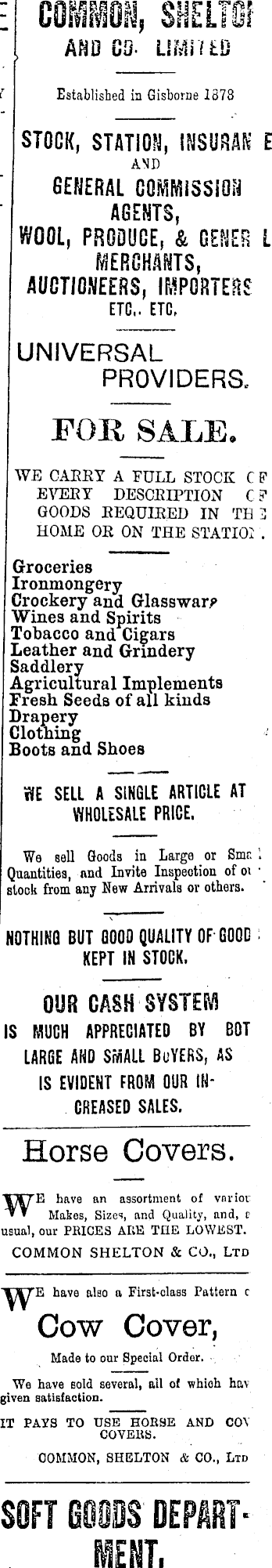 (lift; 'SfaLLg3 AND CO- LlMi'ltD V Established in Gisborne 1873 [- STOCK, STATION, INSURAN E AND GENERAL COMMISSION AGENTS, WOOL, PRODUCE, & GENER L MERCHANTS, AUCTIONEERS, IMPORTERS ETC.. ETC. UNIVERSAL PROVIDERS. FOR SALE. WE CARRY A FULL STOCK C F EVERY DESCRIPTION C ? GOODS REQUIRED IN TH I HOME OR ON THE STATIOi . Groceries Ironmongery Crockery and. Glassware Wines and Spirits Tobacco and Cigars Leather and Grindery Saddlery Agricultural Implements Fresh Seeds of all kinds Drapery Clothing Boots and Shoes WE SELL A SINGLE ARTICLE AT WHOLESALE PRICE. We sell Goods in Large or Smr. Quantities, and Invite Inspection of 01 • slock from any New Arrivals or others. NOTHING BUT GOOD QUALITY OF GOOD KEPT IN STOCK. OUR CASH SYSTEM IS MUCH APPRECIATED BY BOT LARGE AND SMALL BuYERS, AS IS EVIDENT FROM OUR INCREASED SALES. Horse Covers. WE have an assortment of vnrioi Makes, Sizes, ami Quality, and, r usual, our PRICES ARE THE LOWEST. COMMON SHELTON & CO„ Ltd have also a First-class Pattern c Cow Cover, Made to our Special Order. We have sold several, all of whioh ha\ given satisfaction. IT PATS TO USE HORSE AND CO\ COVERS. COMMON, SHELTON & CO., Ltd I