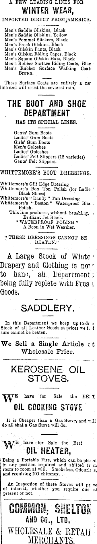 A FEW LEADING LINES FOR WINTER WEAR, IMPORTED DIRECT FROMjAMERICA. Men’s Saddle Oilskins, Black Men’s Saddle Oilskins, Yellow Men’s Pommel Slickers, Black Men’s Frock Oilskins, Black Men’s Oilskin Pants, Black Men’s Oilskin Riding Capes, Black Men’s Squam Oilskin Hats, Black Men’s Rubber Surface Riding Coats, Blac Men’s Rubber Surface Walking Coatt Brown. These Surface Coats aro entirely a noline and will resist the severest rain. THE BOOT AND SHOE DEPARTMENT HAS ITS. SPECIAL LINES. Gents’ Gum Boots Ladies’ Gum Boots Girls' Gum Boots Men's Goloshes Ladies’ Goloshes Ladies’ Felt Slippers (12 varieties) Gents’ Felt Slippers. WHITTEMOEE’S BOOT DEEBSIEGS, Whittemore’s Gilt Edge Dressing Whittemore’s Bon lon Polish (for Ladie ’ Black Shoes) Whittemore’s “ Dandy ” Tan Dressing Whittemore’s “Boston” Waterproof Blac Polish. This line produces, without brubhiug, . Brilliant Jet Black. " WATERPROOF POLISH ” A Boon in Wet Weather. ” THESE DRESSINGS CANNOT BE ■ BEATEN.” A Large Stock of Wiate • Drapery and Clothing is ncr • to han<i, aii Department i being fully replete With Fres . Goods. SADDLERY. In this Department we keep up-to-d; a Stock cf all Leather Goods at prices we I 1 sure cannot be beaten. We Sell a Single Article i t Wholesale Price. KEROSENE OIL STOVES. have for Sale the BE: T OIL COOKING STOVE It is Cheaper than a Gas Stove-, and v ill do all that a Gas Stove will do. w E have for Sale the Best OIL HEATER, Being a Portable Fire, which cachepiar d in any position required and shifted fr m room to room at will. Smokeless, Odourlt s, and requiring NO chimney. An Inspection of these Stoves will pr ve of inter, st, whether you require one at present or not. im AND GO,, LTD. WHOLESALE & RETAII MERCHANTS.