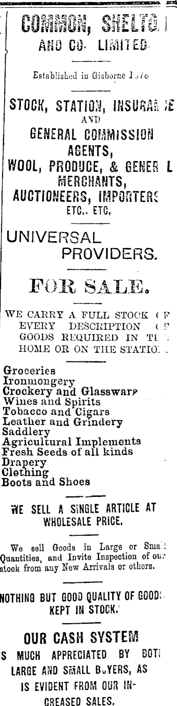 03* on*.iLs y. AND CO- LIMITEDEstablished iu Gisborne Ij/o STOCK, STATION, INSURA:. IE AVI) GENERAL COMMISSION AGENTS, WOOL, PRODUCE, & GENEB L MERCHANTS, AUCTIONEERS, IMPORTERS ETC,. ETC, UNIVERSAL PROVIDERS. FOR SALE. WE CAREY A FULL STOCK ( F EVERY DESCRIPTION ( GOODS REQUIRED IN TL HOME OR ON THE STATIC. Groceries Ironmongery Crockery and Glassware Wines and Spirits Tobacco and Cigars Leather and Grindery Saddlery Agricultural Implements Fresh Seeds of all kinds Drapery Clothing Boots and Shoes WE SELL A SINGLE ARTICLE AT WHOLESALE PRICE. We sell Goods in Large or Srua . Quantities, and Invite Inspection of our stock from any New Arrivals or others. NOTHING BUT GOOD QUALITY OF GOOD: KEPT IN STOCK. OUR CASH SYSTEM IS MUCH APPRECIATED BY BOTi LARGE AND SMALL BuYERS, AS IS EVIDENT FROM OUR INCREASED SALES.