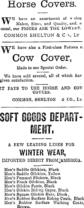 Horse Covers WE have an assortment of v riou Makes, Sizer, and Quality, and, a usual, our PRICES AllE THE LOWEST. COMMON SHELTON & C >., Lt have also a First-class Pattern o. Cow Cover, Made to our Special Order. We have sold several, all of which hav given satisfaction. IT PAYS TO USE lIOItSE AND COV COVEItS. COMMON, SHELTON & CO., Lt. SOFT 00608 DEPARTMENT. A FEW LEADING LINES FOR WINTER WEAR, IMPORTED DIRECT FROMjAMERICA, Men’s Saddle Oilskins, Black Men’s Saddle Oilskins, Yellow Men’s Pommel Slickers, Black Men’s Frock Oilskius, Black Men’s Oilskin Pants, Black Men’s Oilskin Riding Capes, Black Men’s Squam Oilskin Hats, Black, Men’s Rubber Surface Riding Coats, Black Men’s Rubber Surface Walking Coats, Brown.