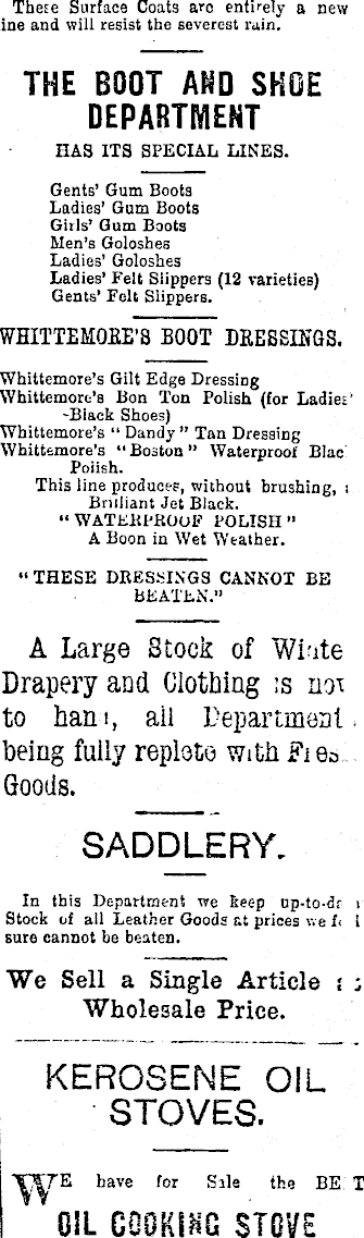 These Surface Coats arc entirely a new line and will resist the severest rain. THE BOOT AND SHOE DEPARTMENT HAS ITS SPECIAL LINES. Gents’ Gum Boots Ladies’ Gum Boots Girls’ Gum Boots Men’s Goloshes Ladies’ Goloshes Ladies’ Felt Slippers (12 varieties) Gents’ Felt Slippers. WHITTEMORE’S BOOT DRESSINGS. Whittemore’s Gilt Edge Dressing Wbittemore’s Bon Ton Polish (for Ladie; -Black Shoes) Whittemore’s “ Dandy” Tan Dressing Whittemore’s “ Boston ” Waterproof Blac Poiish. This line produces, without brushing, i Brilliant Jet Black. “ WATERPROOF POLISH ” A Boon in Wet Weather. •‘THESE DRESSINGS CANNOT BE BEATEN." A Large Stock of Wide Drapery and Clothing ;s not to ham, all Department being fully replete with Goods. SADDLERY, In this Department we kec-p up-to-dr Stock of all Leather Goods at prices v.e f sure cannot be beaten. We Sell a Single Article : ; Wholesale Price. KEROSENE OIL STOVES. bave for Site the BE T OIL COOKING STOVE