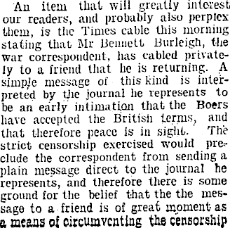 An item that will greatly interest our readers, and probably also perplex them, is the Times cable this morning stating that Mr Bennett Burleigh, the war correspondent, lias cabled privately to a friend that he is returning. A .simple message of this kind is interpreted by the journal he represents to be an early intimation that the Boers have accepted the British terms, and that therefore peace is in sight. The strict censorship exercised would preclude the correspondent from sending a plain message direct to the journal he represents, and therefore there is some ground for the belief t-hat the the message to a friend is of great moment as a means of.circumventing the censorship