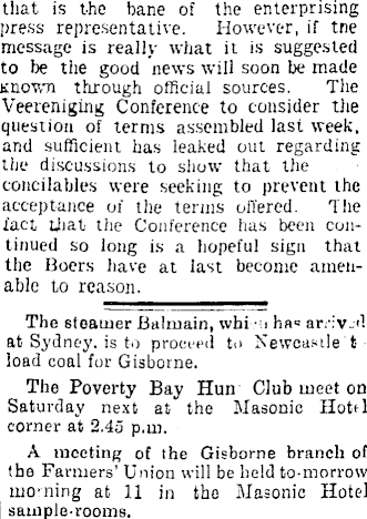 that is the bane of the enterprising press representative. However, if trie message is really what it is suggested to be the good news will soon be made Known through official sources. The Veereruging Conference to consider the question of terms assembled last week, and sufficient has leaked out regarding the discussions to show that the coneilables were seeking to prevent the acceptance of the terms offered. The fact that the Conference has been continued so long is a hopeful sign that the Boers have at last become amenable to reason. The steamer Balmain, whi - i ha« ar'v.d at Sydney, is to proceed to Newcastle t load coal for Gisborne. The Poverty Bay Hun Club meet on Saturday next at the Masonic Hotrl corner at 2.45 p.m. A meeting of the Gisborne branch of the Farmers’ Union will be held to-morrow mo iling at 11 in the Masonic Hotel sample-rooms.