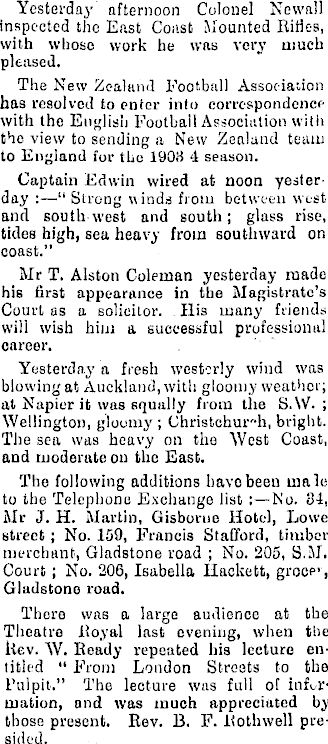 Yesterday afternoon Colonel Newell inspected the East Const Mounted Rifles, with whose work he was very much pleased. The New Zealand Football Association has resolved to enter into correspondence with the English Football Association with the view to sending a New Zealand team to England for the 1903 4 season. Captain Edwin wired at noon yesterday : —“ Strong winds from between west and southwest and south; glass rise, tides high, sea heavy from southward on coast.” Mr T. Alston Coleman yesterday made his first appearance in the Magistrate’s Court as a solicitor. His many friends will wish him a successful professional career. Yesterday a fresh westerly wind was blowing at Auckland, with gloomy weather; at Napier it was squally from the S.W. ; Wellington, gloomy ; Christchurch, bright. The sea was heavy on the West Coast, and moderate on the East, The following additions havobeeu male to the Telephone Exchange list : No. 84, Mr J. H. Martin, Gisborne Hotel, Lowe street ; No. 159, Francis Stafford, timber merchant, Gladstone road ; No. 205, S.M. Court ; No. 206, Isabella liackett, groce', Gladstone road. There was a large audience at the Theatre Royal last evening, when the Rev. W. Ready repeated his lecture entitled “ From London Streets to the Pulpit.” The lecture was full of information, and was much appreciated by those present. Rev. B. F. Rothwell presided.