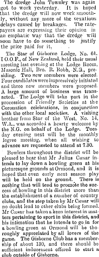 The dredge John Townley was again got to work yesterday. It is hoped that the dredge will now work smoothly, without any inore of the vexatious delays caused by breakages. The ratepayers are expressing their opinion in an emphatic way that the dredge will soon have to do something to justify the price paid for it. The Star of Gisborne Lodge, No. 61. I 0.0. F., of New Zealand, held their usual meeting last evening at the Lodge Room, Masonic Hall, Bro. R, Robb, N. 9., presiding. Two new members were elected. Four candidates were impressively initiated and three new members were proposed. A large amount of business was transacted. The Lodge will take part in the procession of Friendly Societies at the Coronation celebrations, in conjunction with the other local societies. A visiting brother from Star of the West, No. 14, W.A., was accorded a hearty welcome by the N.G. on behalf of the Lodge. Tue 3 day evening next will be the monthly legveo meeting, when all wishing to advance are requested to attend at 7.80. Bowlers throughout the district will be pleased to hear that Mr Julius Ciesar intends to lay down a bowling green at his picturesque grounds at Ormond, and it is hoped that even early next season play will be held on the ground. There is nothing that will tend to promo’te the success of. bowling in this district inoro than the establishment of a number of country clubs, and the step taken by Mr Ciesar will no doubt lead to other clubs being formed. Mr Ciesar has taken a keen interest in matters pertaining to sport in this district, and his intimation that he intends to go in for a bowling green at Ormond will be thoroughly appreciated by all lovers of the game. The Gisborne Club has a membership of about 130, and thero should be sufficient inducement offered to start a club outside of Gisborne.