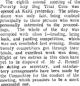 The eighth animal meeting of the Poverty bay Dog Trial Ciuo was opened at Kaiti yesterday. The attendance was only fair, being confined principally to those persons who were personally interested in the proceedings. . The whole of the day was occupied with class I—heading, bring back, and yarding competition, which was not concluded last evening, Some tAvenly competitors got through their trials, and excellent work was done. Eight or ten entries in this class have yet to he disposed of. Mr J. Russell is Acting as secretary, and satisfactory arrangements have been made by the Committee for the conduct of the meeting, which promises to be a most successful one.