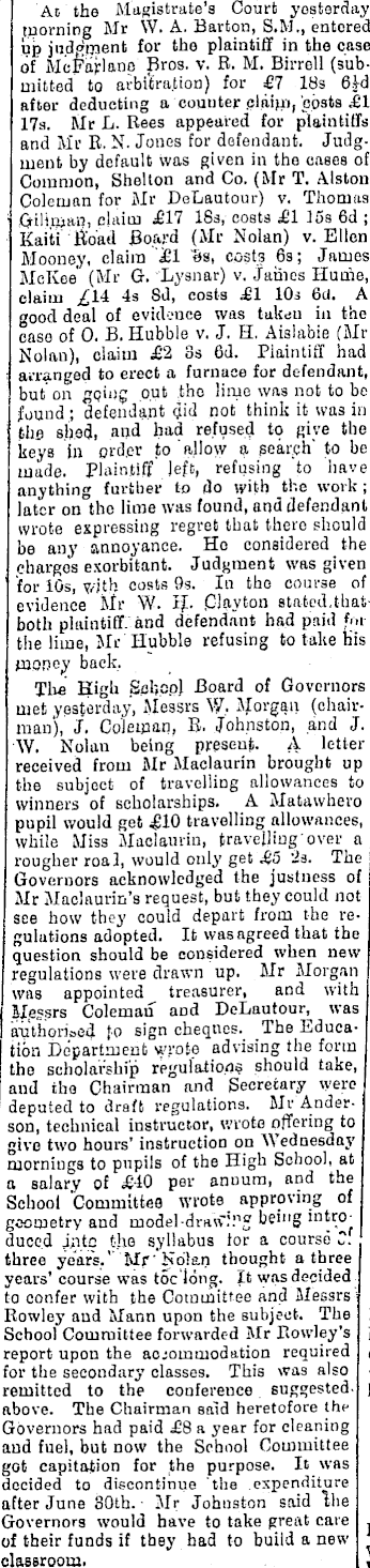 At tho Magistrate’s Court yosterday morning Mr \V. A. Barton, S.M., entored up judgment for tho plaintiff in tho case of McFai’lanp Bros. v. R. M. Birrell (submitted to arbitration) for £7 18s 64d after deducting a counter .claim, posts .£1 17s. Mr L. Rees appeared for plaintiffs and Mr R. N. Jones for defendant. Judgment by default was given in tho cases of Common, Shelton and Co. (Mr T. Alston Coleman for Mr DeLautour) v. Thomas G-ilinjan, claim £l7 18s, costs £1 15s 6d ; Kaiti Jffoail Board (Mr Nolan) v. Ellen Mooney, claim £1 6s, costs 6s; James McKee' (Mr G. Lysnar) v. James Hume, claim £l4 4s Sd, costs £1 10s 6ii. A good deal of evidence was taken in the caso of 0. B. Hubble v. J. H. Aisiabie (Mr Nolan), claim £2 3s 6d. Plaintiff had arranged to erect a furnace for defendant, but on gping out the lime wa3 not to be found ; defendant did not think it was in the shed, and had refused to give the keys in prd.cr to allow a search' to be made. Plaintiff left, refusing to have anything further to do with the work; later on the lime was found, and defendant wrote expressing regret that there should be any annoyance. Ho considered the charges exorbitant. Judgment was given for 10s, with costs 9s. In tho course of evidence Mr \V. If. Clayton stated.thatboth plaintiff, and defendant had paid for the lime, Mr Hubble refusing to take bis money back. The High School Board of Governors met yesterday, Messrs W, Morgan (chairman), J. Coleman, B. Johnston, and J. W. Nolan being present. A letter received from Mr Maclaurin brought up the subject of travelling allowances to winners of scholarships. A Matawhero pupil would get £lO travelling allowances, while Miss Maclaurin, travelling over a rougher roal, would only get £5 2s. The Governors acknowledged the justness of Mr Maclaurin’s request, but they could not see how they could depart from the regulations adopted. It was agreed that the question should be considered when new regulations were drawn up. Mr Morgan was appointed treasurer, and with j Messrs Colemau and DeLautour, was authorised fp sign cheques. The Education Department wrote advising the form the scholarship regulations should take, and the Chairman and Secretary were deputed to draft regulations. Mr Anderson, technical instructor, wrote offering to give two hours’ instruction on M ednesday mornings to pupils of the High School, at a salary of £4O per annum, and the School Committee wrote approving of geometry and model-dra«h n 5 being duccd lute the syllabus tor a course C. three years. Mr 'Nolan thought a three years’ course was toe long. It was decided to confer with the Committee and Messrs Rowley and Mann upon the subject. The School Committee forwarded Mr Rowley's report upon the accommodation required for the secondary classes. This was also remitted to the conference suggestedabove. Tbe Chairman said heretofore the Governors had paid £8 a year for cleaning and fuel, but now the School Committee got capitation for the purpose. It was decided to discontinue the expenditure after June 80th. Mr Johnston said the Governors would have to take great care of their funds if they had to build a new classroom-