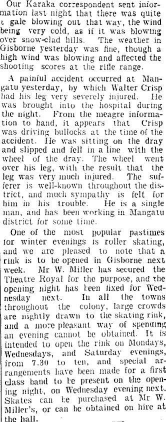 Our Karaka correspondent sent information last night that there was quite i gale blowing out that way, the wind being very cold, as ii it was blowing over snow-clad hills. The weather in Gisborne yesterday was fine, though a high wind was blowing and affected the shooting scores at the ride range. A painful accident occurred at Mangatu yesterday, by which Walter Crisp had his leg very severely injured. He was brought into the hospital during the night. From the meagre information to hand, it appears that Crisp was driving bullocks at the time of the accident. He was sitting on the dray and slipped and fell in a line with the wheel of the dray. The wheel went over his leg, with the result that the leg was very much injured. The sufferer is well-known throughout the district, and much sympathy is felt for him in his trouble. lie is a single man, and has been working in Mangatu district for some time. One of the most popular pastimes lor winter evenings is roller skating, and we arc pleased to note that a rink is to be opened in Gisborne next week. Mr W. Miller has secured the Theatre Royal for the purpose, and the opening night has been fixed for Wednesday next. In all the towns throughout the colony, large crowds are nightly drawn to the skating rink, and a more pleasant way of spending an evening cannot be obtained. It is intended to open the rink on Mondays, Wednesdays, and Saturday evenings, from 7.30 to ten, and special arrangements have been made for a first class band to be present on the opening night, on Wednesday evening next. Skates can be purchased at Mr W. Miller’s, or can be obtained on hire at the hall.