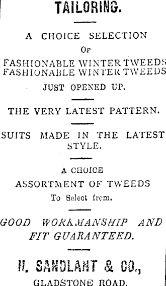 TAILORiNG. A CHOICE SELECTION Op FASHIONABLE WINTER TWEEDS FASHIONABLE WINTER TWEEDS JUST OPENED UP. THE VERY LATEST PATTERN. SUITS MADE IN THE LATEST STYLE. A CHOICE ASSORTMENT OF TWEEDS To Select from. GOOD WORKMANSHIP AND FIT GUARANTEED. 11. SANDLANT & 00,, GLADSTONE ROAD.