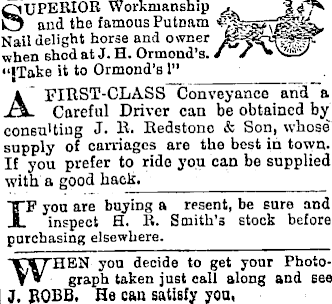 when shod at J. H. Ormond’s. / “{Take it to Ormond's 1” A FIRST-CLASS Conveyance and a Careful Driver can be obtained by consulting J. R. Redstone & Son, whose supply of carriages are the best in town. If you prefer to ride you can be supplied with a good hack. IF you are buying a resent, be sure and inspect H. R. Smith's stock before purchasing elsewhere. w«J HEN you decide to get your Photograph taken just call along and see J. ROBB. He can satisfy you,