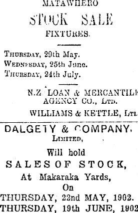 MATAWIIEBO S'i’UUK SALE TIXTIiKES. Thursday, 29th May. Wednesday, 25th Juno. Thursday, 24th July. N.Z LOAN & MERCANTILE AGENCY CO., Ltd. WILLIAMS A KETTLE, Ltl ~DALGEIY & r OMPANY. Limited, Will hold SALES OF STOCK, At Makaraka Yards, On THURSDAY, 22nd MAY, 1902. THURSDAY, 19th JUNE, 1902,