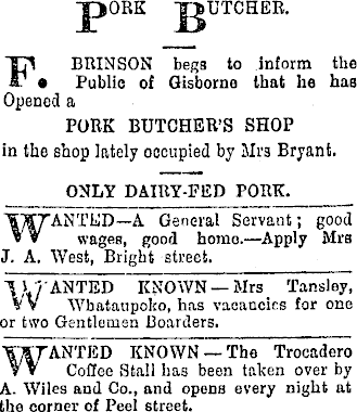 JpORK JgUTCHER. F BRINSON begs to inform the • Public of Gisborne that he has Opened a PORK BUTCHER’S SHOP in the shop lately occupied by Mrs Bryant. ONLY DAIRY-FED PORK. "ANTED—A General Servant; good wages, good homo.—Apply Mrs J. A. West, Bright street. \VT ANTED KNOWN —Mrs Tansley, YV Wbataupoko, has vacancies for one or two Gentlemen Boarders. TTTTANTED KNOWN —The Trocadero Y v Coffee Stall has been taken over by A. Wiles and Co., and opens every night at the corner of Peei street.