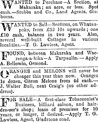 WANTED to Purchase —A Section, at Makaraka; an acre, or less. Spot cash.—Stubbs and Co., Land Agents, Gisborne. WANTED to Sell—Sections, on Whfttnupoko, from £52 10s upwards ; one £lO cash, balance in two years. Also, several well-built Cottnge3 in various localities.—T. G. Lawless, Agent. "jTTAOUND, betweon Makaraka and AYaeID renga-a-bika—A Tarpaulin. Apply A. Bellemin, Ormond. •rf VRANGES and MELONS will never be Vr cheaper this year than now. Oranges Is dozen, Citron Melons from 4d each.— J. Walter Bull, next Craig’s (no other address). FOIt SALE—A first-class Tobacconist’s Business, billiard saloon, and hairdresser’s shop; lease of premises for 10 years, or longer, if desired.—Apply T. G. Lawless, Agent, Gladstone road.