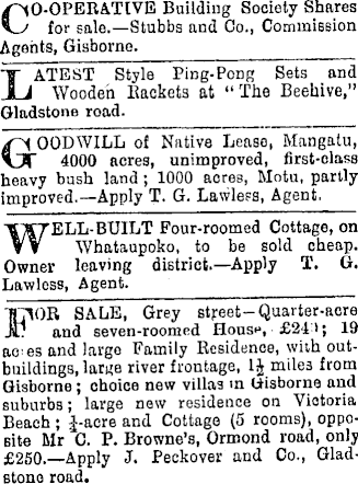 CO-OPERATIVE Building Society Shares for sale.—Stubbs and Co., Commission Agents, Gisborne. LATEST Style Ping-Pong Sets and Wooden Backets at “ The Beehive,” Gladstone road. OODWILL of Native Lease, Mangatu, 4000 acres, unimproved, first-class heavy bush land ; 1000 acres, Motu, partly improved.—Apply T. G. Lawless, Agent. WELL-BUILT Four-roomed Cottage, on Whataupoko, to be sold cheap. Owner leaving district. —Apply T. G. Lawless, Agent. T|7lOR SALE, Grey street-Quarter-acre Ji? and seven-roomed House, £24'; 19 ac-es and largo Family Residence, wiih outbuildings, large river frontage, 1J miles from Gisborne ; choice new villas in (iisborne and suburbs; large new residence on Victoria Beach ; J-acre and Cottage (5 rooms), opposite Mr C. P. Browne’s, Ormond road, only £23o.—Apply J. Peckover and Co., Gladstone road.