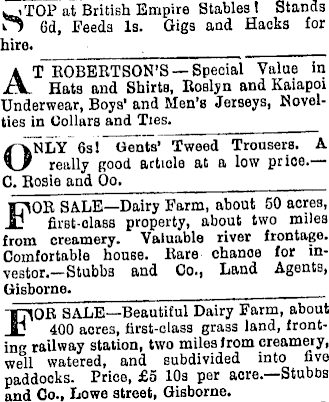 w TOP at British Empire Stables 1 Stands r} Gd, Feeds Is. Gigs and Hacks for hire. AT EOBERTSON’S Special Value in Hats and Shirts, Roslyn and Kaiapoi Underwear, Boys’ and Men’s Jerseys, Novelties in Collars and Ties. ONLY 6s! Gents’ Tweed Trousers. A really good article at a low price.— C. Bosie and 00. FOE SALE—Dairy Farm, about 50 acres, first-class property, about two miles from creamery. Valuable river ftontage. Comfortable house. Bare chanoe for investor.—Stubbs and Co., Land Agents, Gisborne. FOB SALE —Beautiful Dairy Farm, about 400 acres, first-class grass land, fronting railway station, two miles from creamery, well watered, and subdivided into five paddocks. Price, £5 10s per acre.—Stubbs and Co., Lowe street, Gisborne.