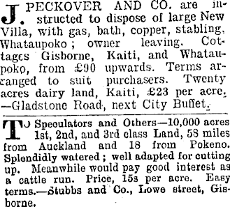 JPECKOVER AND CO. are in- . structed to dispose of large New Villa, with gas, bath, copper, stabling, Whataupoko ; owner leaving. Cottages Gisborne, Kaiti, and Whataupoko, from £9O upwards. Terms arranged to suit purchasers. Twentyacres dairy land, Kaiti, £23 per acre. —Gladstone Road, next City Buffet. TJ Speculators and Others—lo,ooo acres Ist, 2nd, and 3rd class Land, 58 miles from Auckland and 18 from Pokeno. Splendidly watered ; well adapted for cutting up. Meanwhile would pay good interest as a cattle run. Price, 15s per acre. Easy terms. —Stubbs and Co., Lowe street, Gisborne.