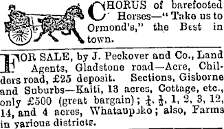 CHORUS of barefooted ' Horses—“ Take us to Ormond’s,” the Best in town. IpiOß SALE, by J. Peckover and Co., Land j Agents, Gladstone road—Acre, Childers road, £25 deposit. Sections, Gisborne and Suburbs—Haiti, 13 acres, Cottage, etc., only £SOO (great bargain); J, 1,2, 3, 12, 14, and 4 acres, Whataupjko; also, Farms in yarious districts.