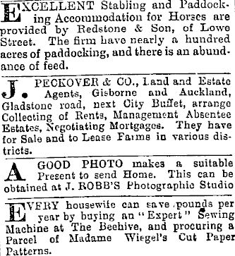 EXCELLENT Stabling and Paddocking Accommodation for Horses are provided by Redstone & Son, of Lowe Street. The firm have nearly a hundred acres of paddocking, and there is an abundance of feed. PECKOVER & CO., Land and Estato • Agents, Gisborne anil Auckland, Gladstone road, next City Buffet, arrango Collecting of Rents, Management Absentee Estates, Negotiating Mortgages. They have for Sale and to Lease Farms in various disA GOOD PHOTO makes a suitable Present to send Home. This can be obtained at .T. ROBB’S Photographic Studio EVERY housewife can Eave pounds per year by buying an “ Expert ” Sewing Machine at The Beehive, and procuring a Parcel of Madame Wiegel’s Cut Paper Patterns.