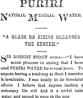 "A GLASS ON RISING CLEANSES THE SYSTEM.” »MR ROBERT STOUT writes:—" I havo much pleasure in stating that I have used PUIUHI WATER (or several years. To anyono having a tendency to Gout I consider it invaluable. I can testify to it 3 beneficial effects. I believe that anyone leading a I sedentary life will find it a useful table ' wator, and second to none in the mar