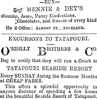 MEN NlL'] & DEY’S Biscuits, Jams, Fancy Confections, 'Chocolates, and Sweets of every bind. He d Office : Ai.dkkt St , A ttki.and. EXCURSONS TO TATAPOURI. .’REILLY "OROTQERS & rf'NO. Beg to notify that they will run a Coach to TATAPOURI SEASIDE RESORT Every SUNDAY' during the Summer Months at CHEAP FARES. This offers a splendid opportunity to anyone desirous of spending a few hours at the beautiful Seaside Resort of Tatapouri.