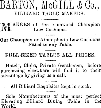 BARTON, McGILL & Co., BILLIARD TABLE MAKER 3. MAKERS of the renowned Champion Low Cushions. Our Champion or A tun photic Low Cushions Fitted to any Table. FULL-SIZED TABLES ALL PEICES. Hotels, Clubs, Private Gentlemen, before purchasing elsewhere will Cud it to their advantage by giving us a call. All Billiard Requisites kept in stock. Solo Manufacturers of the most perfect Elevating Billiard Dining Table in the World.