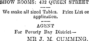 SUOW ROOMS: 422 QUEEN STREET. We make all sized Tables. Trice List on application. AGENT For Poverty Bay District— ME J. M. GUMMING.