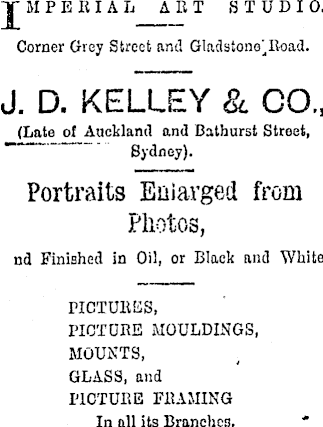JMPEIt IA h ART STUDIO. Corner Grey Street and GlndstoneMtoad. J. D. KELLEY & GO., (Date o£ Auckland and Bathurst Street, ~ Sydney). Portraits Enlarged from Photos, nd Finished in Oil, or Black and White. PICTURES, PICTURE MOULDINGS, MOUNTS, GLASS, and PICTURE FRAMING In all its Branches.