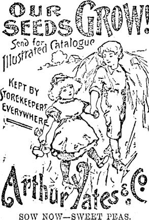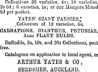 Collections 30 varieties, 4s; 18 varieties, 2s Gd ; G varieties, Is; or our Mangero Mixed 6d per packet. YATES’ GIANT PANSIES,; Collection of 12 varieties, ss. CARNATIONS, DIANTHUS, PETUNIAS, Also PLANT BULBS. Daffodils, ss, 10s, and 20s Collections, post free. Catalogues on application to local agent, or ARTHUR YATES & 00 , SEEDSMEN, AUCKLAND.