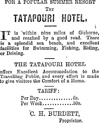 FOR A POFULAR SUMMER RESORT Try TATAPOOB[ HOTEL, IT is 'within nine miles of Gisborne, and reached by a good road. There is a splendid sea beach, and excellent facilities for Swimming, Fishing, Riding, or Driving. THE TATAPOUM HOTEL offers Excellent Accommodation to the Travelling Public, and every effort is made to give visitors the Comfort of a Home. TARIFF: Per Day 6s. Per Week 30s. C. H. BUEDETT, Proprietor.