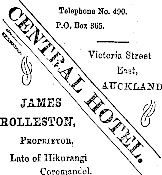 Telephone No. 490. P.O. Box 305. -V\ Ai Victoria Street East, AUCKLAND JAMES ROLLE3TOH, PsOrUIETOB, Late of Hikurnngi Coromandel.