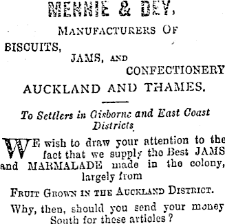 mm a & or/, Manufacturers Of BISCUITS, JAMS, AND CONFECTIONERY. AUCKLAND AND THAMES. To Settlers in Gisborne and hast Coast Districts TS wish to draw your attention to the fact that we supply the Best JAMS and MARMALADE made in the colony, largely from FbDIT GIiOWX IN THE AUCKLAND DISTRICT. Whv, then, should you send your money South for these articles ?