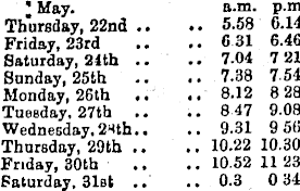 ! May. a.m. p.m Thursday, 22nd .. .. 5,58 0.14 Friday, 23rd .. 6 31 6.46 Saturday, 24th .. .. 7.04 7 21 Sunday, 25th .. 7.38 7-54 Monday, 26th .. 8.12 8 28 Tuesday, 27th .. 8 47 9.08 Wednesday. 2Hth.. .. 9.31 9 56 Thursday, 29th .. .. 10.22 10.30 Friday, 30th .. 10.52 11 23 Saturday, 31st .. .. 0.3 0 34