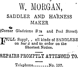 W. MORGAN, SADDLER AND HAkNESS MAKER (Corner Gladstone B}a and Pcgl Street). T7IULL Suppß , all kinds of SADDLERY A? on hard and to order on the Shortest Notice. REPAIRS PROMPTLY ATTENDED TO. Telephone. No. 157.