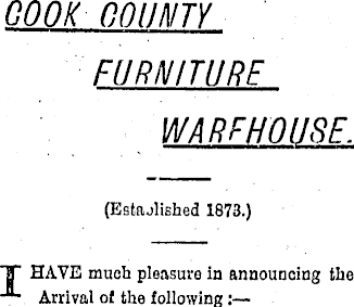 COOK COUNTY FURNITURE WARE HOUSE. (Estaolished 1873.) HAVE much pleasures in announcing the Arrival of the following :
