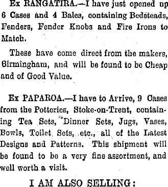 Ex RANGATIRA.—I have just opened np 6 Cases and 4 Bales, containing Bedsteads, Fenders, Fender Knob 3 and Fire Irons to Match. These have como direct from the makers, Birmingham, and will be found to be Cheap and of Good Value. Ex PAPAROA.—I have to Arrive, 9 Cases from the Potteries, Stoke-on-Trent, containing Tea Sets, Dinner Sets, Jugs, Vases, Bowl 3, Toilet Sets, etc., all of the Latest Designs and Patterns. This shipment will be found to be a very fine assortment, and well worth a visit. I AM ALSO SELLING: