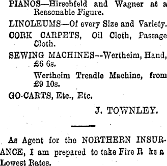 PIANOS —Hirsohfeld and Wagner at a Seasonable Figure. LINOLEUMS—Of every Size and Variety. COEK CAEPETS, Oil Cloth, Passage Cloth. SEWING MACHINES-Wortheim, Hand, £6 6s. Wertheim Treadle Machine, from £9 10s. GO-CAETS, Etc., Etc. J. TOWNLEY. As Agent for the NORTHEBN INSURANCE, I am prepared to take Fire R ke a Lowest Bates.