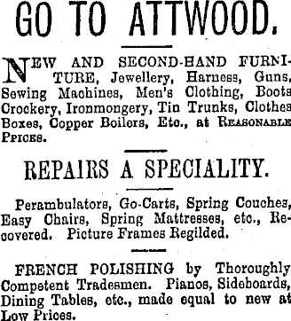 GO TO ATTWOOD. New and second-hand furniture, Jewellery, Harness, Guns, Bewing Maohines, Men's Clothing, Boots Crockery, Ironmongery, Tin Trunks, Clothes Boxes, Copper Boilers, Eto., at Reasonable PricEs. REPAIRS A~SPECIALITY. Perambulators, Go-Carts, Spring Couches, Easy Chairs, Spring Mattresses, eto., Recovered. Picture Frameß Regilded. FRENCH POLISHING by Thoroughly Competent Tradesmen. Pianos, Sideboards, Dining Tables, etc., made equal to new at Low Prices.