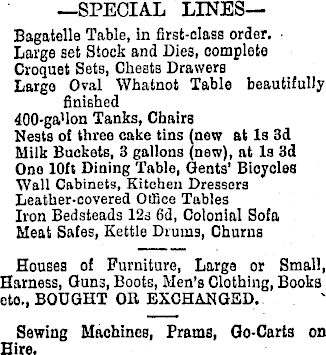 —SPECIAL LINES— Bagatelle Table, in first-class order. • Large set Stock and Dies, complete Croquet Sets, Chests Drawers Largo Oval Whatnot Table beautifully finished 400-ga'lon Tanks, Chairs Nests of three cake tins (new at Is 3d Milk Buckets, 3 gallons (new), at Is 3d Ono 10ft Dining Table, Gents’ Bicycles Wall Cabinets, Kitchen Dressers Leather-covered Office Tables Iron Bedsteads 12s 6d, Colonial Sofa Meat Safes, Kettle Drums, Churns Houses of Furniture, Large or Small, Harness, Guns, Boots, Men’s Clothing, Books eto., BOUGHT OR EXCHANGED. Sewing Machines, Prams, Go-Carts on Hire.