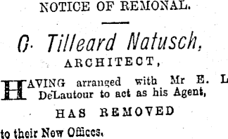NOTICE OF REMONAL. 0 Tilleard Natusch, architect, HAVINCi arranged with . Mr E. DeLautour to act as his Agent, HAS REMOVED to their New Offices.