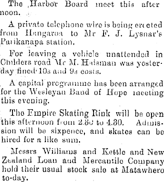 The Harbor Board meet this after noon. A private telephone wire is being on cted from llnngaroM to Mr P. J. Lysnar’s Parikanapa station. For leaving a vehicle unattended in Clnlders road Mr M. Haiamau was yesterday filled'los and 9s eosis. A capital programme has been arranged for the Wesleyan Baud of Hope meeting this evening. Tho Empire Skating Rink will be open this afternoon from 2.be) to 4.80. Admission will bo sixpence, and skates can bo hired for a like sum. Messrs Williams and Kettle and New Zealand Loan and Mercantile Company hold their usual stock sale at Matavvhero to-day.