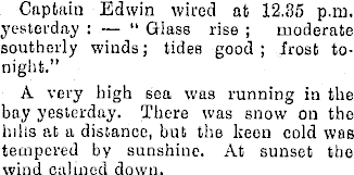 Captain Edwin wired at 12.35 p.m. yesterday : “ Glass rise ; moderate southerly winds; tides good ; frost tonight." A very high sea was running in the bay yesterday. There was snow on the lulls at a distance, hut the keen cold was tempered by sunshine. At sunset the wind calmed down.