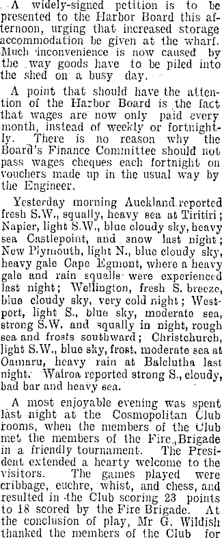 A widely-signed petition is to he presented to the Harbor Board this afternoon, urging that- increased storage accommodation lie given at the wharf. Much 'inconvenience is now caused by the way goods have to be piled into the shed on a busy day. A point that should have the attention of the Harbor Board is the fact that wages are now only paid every month, instead of weekly or fortnightly. There is no reason why the Board’s Finance Committee should not pass wages cheques each fortnight on vouchers made up in the usual way by the Engineer. Yesterday morning Auckland.reported fresh S.W., squally, heavy sea at Tiritiri; Napier, light S.W., blue cloudy sky,heavy sea Castlepoint, and 3now last night; Now Plymouth, light N., blue cloudy sky, heavy gale Capo Egmont, where a heavy gale and rain squalls were experienced last night; Wellington, fresh S. breeze, blue cloudy sky, very cold night; Westport, light S., blue sky, moderato sea, strong S.W. and squally in night, rough sea and frosts southward ; Christchurch, light S.W., blue sky, frost, moderato sea at Oatnaru, heavy rain at Balclutha last night. Wairoa reported strong S., cloudy, bad bar and heavy sea. A most enjoyable evening was spent last night at the Cosmopolitan Club rooms, when the members of the Club met the members of the Fire.,Brigade in a friendly tournament. The President extended a hearty welcome to the visitors. The games played were cribbagc, euchre, whist, and chess, and resulted in -the Club scoring 23 points to 18 scored by the Fire Brigade. At the conclusion of play, Mr G. Wildish thanked the members of the Club for