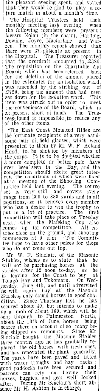 the pleasant evening spent, and stated that they would he glad to play a return match in about a month’s time. The Hospital Trustees held theii' monthly meeting last- evening, wnen the following members were present : Messrs Nolan (in the chair), Tlaramg, Dewing. Joyce, Macfarlane, and Warren. The monthly report showed that there were 27 patients at present in i the Hospital. The Treasurer reported j that the overdraft amounted to. £320. The requisition on the Charitable Aid | Board, which had been referred back ; for the deletion of the amount .placed i in the estimates for an isolation'ward, ; was amended by the striking out of j £750, being the amount that had been j set, down for the isolation ward. This item was struck out in order to meet the convenience of the Board, which is at present short of funds. The Trustee?;..found it impossible .to reduce any of the other items. The East Coast Mounted Rifles are the fortunate recipients of a very handsome pair of field glasses, which were presented to them by Mr W. F. Acland Hood, to be shot for by members of the corps. It is to be doubted whether a more complete or better pair have ever been seen in the Bay, and the competition should excite great interest, the conditions of which were fixed at • a meeting of the Shooting Committee held last evening. The course set is very stiff, and covers every range from 200 to 880 yards and in all positions, so it behoves every member who has a desire to win the trophy to put in a lot of practice. The first ■ompetition will take place on Tuesday next, when the Mafeking Cup also comes up for competition. All entries close on the ground, and shooting commences at 0 a.m. -The Committee hope to have other prizes for tho.se who do not come out top. Sir W. F. Sinclair, of the Masonic Stables, wishes us to state that he will not be purchasing horses at the stables after 12 noon to-day, as he is leaving for the Coast to buy at Tolago Bay and Tokomaru. On Wednesday, June 4th, and until advertised 'he will again buy at the Masonic Stables, only sound horses in good condition. ' Since Thursday last he has secured about 40, but intends to make up a mob of about 100, which will be .sent through to Palmerston North, about the 10th of June, horses being scarce there on account of so many being shipped as remounts. Sinoe Mr Sinclair bought the Masonic Stables three months ago he has gradually replaced the old horses with fresh ones, and has renovated the plant generally. The yards have been paved and fitted ; with water troughs and hay racks ; good paddocks have been secured and patrons can rely on having their horses, buggies, and gear well looked after. During Mr Sinclair’s short ab- 1 sence Mr H. Ashton is in charge.