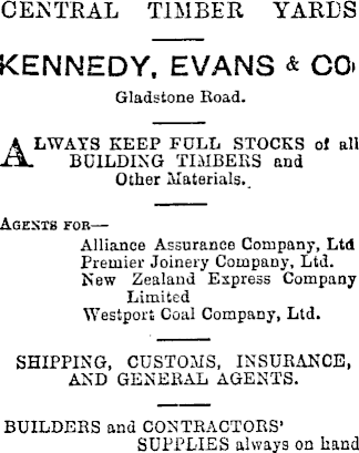 CENTRAL TIMBER YARDS KENNEDY. EVANS & CO* Gladstone Road. Always keep full stocks of ail BUILDING TIMBERS and Other Materials.. Agexts for — Alliance Assurance Company, Ltd Premier Joinery Company, Ltd. New Zealand Express Company Limited Westport Coal Company, Ltd. SHIPPING, CUSTOMS, INSURANCE, AND GENERAL AGENTS. BUILDERS and CONTRACTORS' SUPPLIES always on hand,